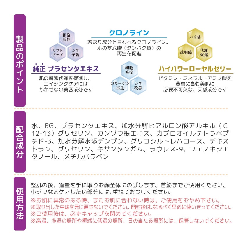 【純正プラセンタエキス】肌の新陳代謝を促進し、エイジングケアにはかかせない美容成分です。