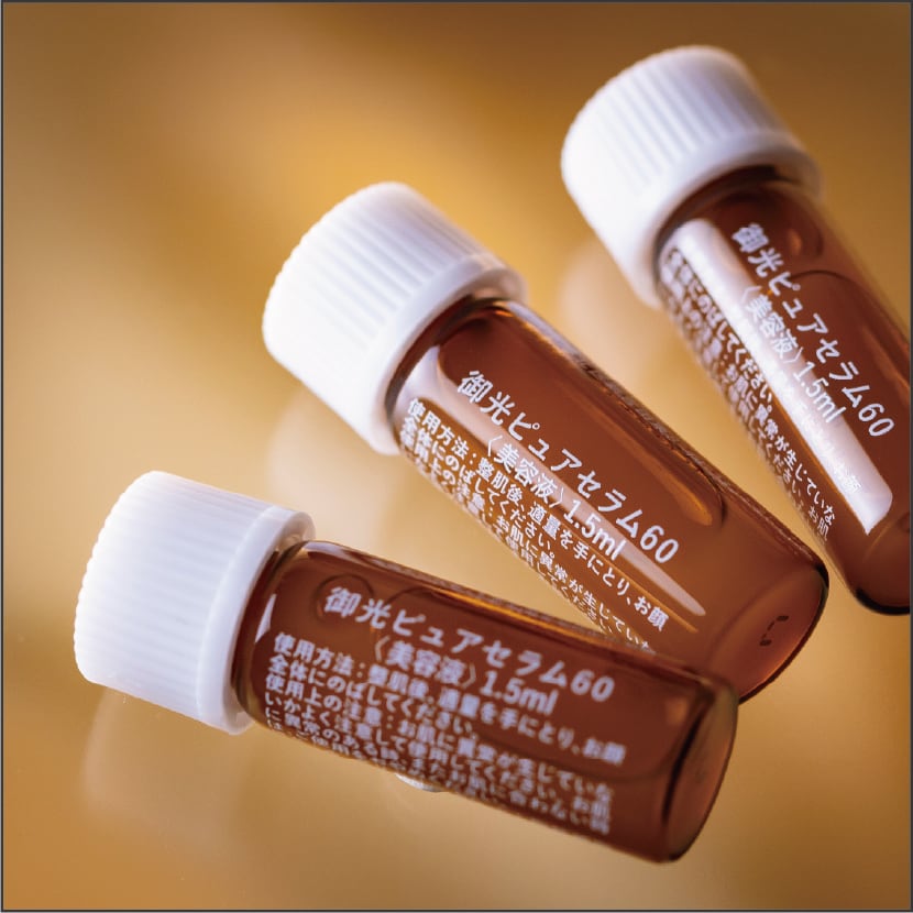 「御光ピュアセラム60」は非常に高濃度な製品であるがため、特別な容器と容量で品質維持に努めています。容器は熱伝導や紫外線から守る遮允ビンを採用。小容量を採用することにより開封による製品の酸化を極力抑えます。